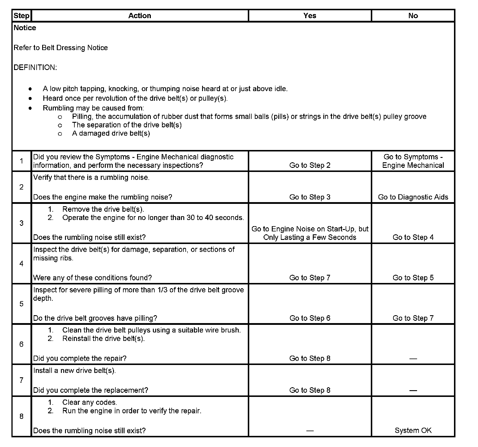 If after replacing the drive belt(s) and completing the diagnostic table, the rumbling is only heard with the drive belt(s) installed, there might be an accessory drive component failure. Varying the load on the accessory drive component(s) may aid in identifying which component is causing the rumbling noise.