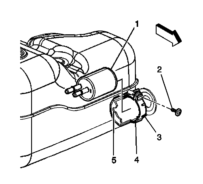 1. Install the fuel filter (1) into the bracket. Ensure that the fuel filter inlet tube is engaged in the fuel tank bracket orientation slot (5).