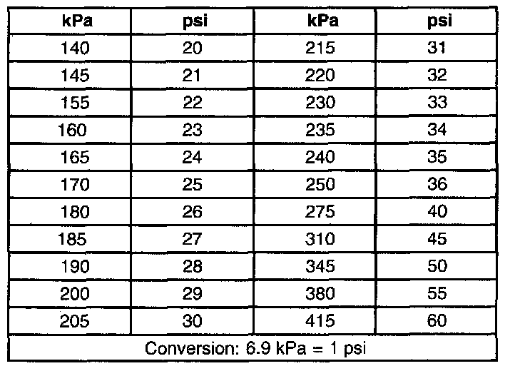 Inflation Pressure Conversion (Kilopascals to PSI)