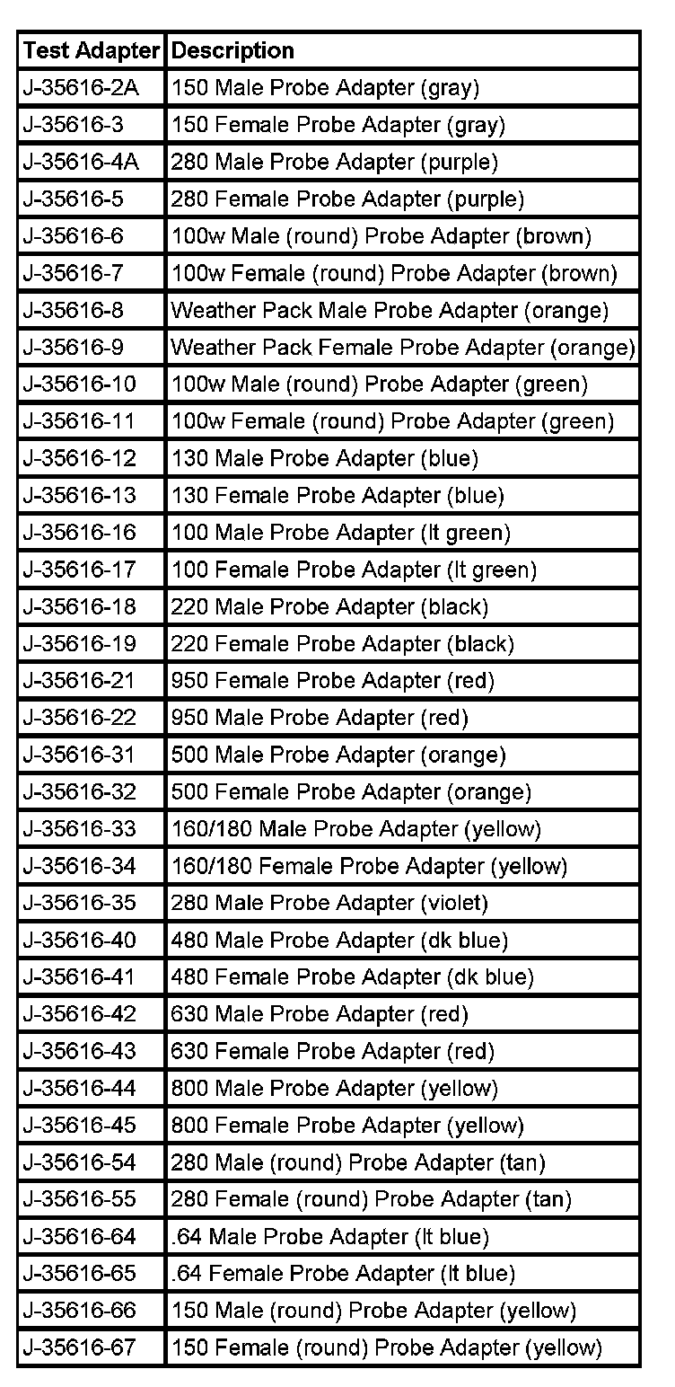 NOTE: Do not insert test equipment probes (DVOM etc.) into any connector or fuse block terminal. The diameter of the test probes will deform most terminals. A deformed terminal will cause a poor connection, which will result in a system failure. Always use the J-35616 GM-Approved Terminal Test Kit or the J 42675 Flat-Wire Probe Adapter in order to front probe terminals. Do not use paper clips or other substitutes to probe terminals.