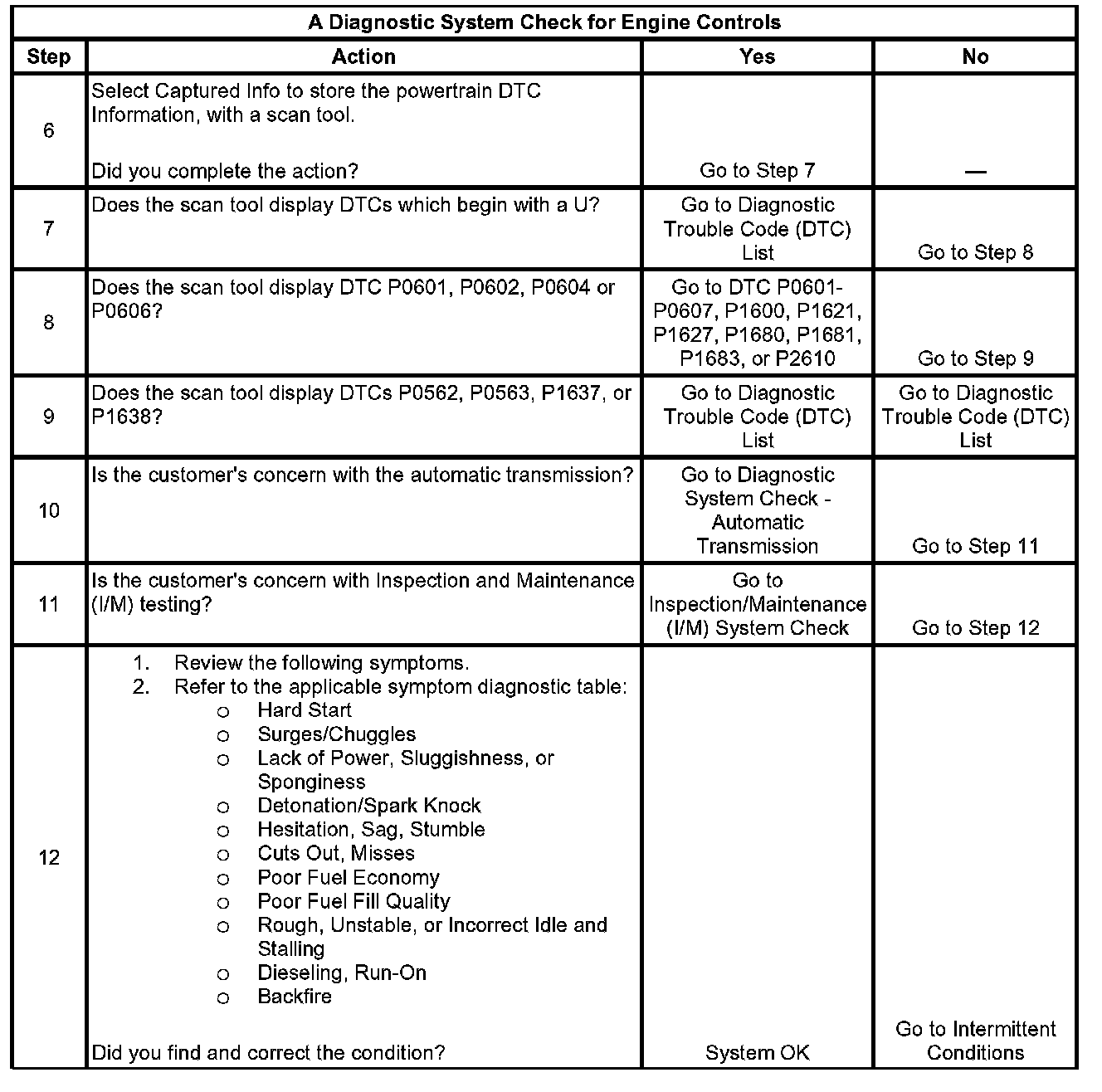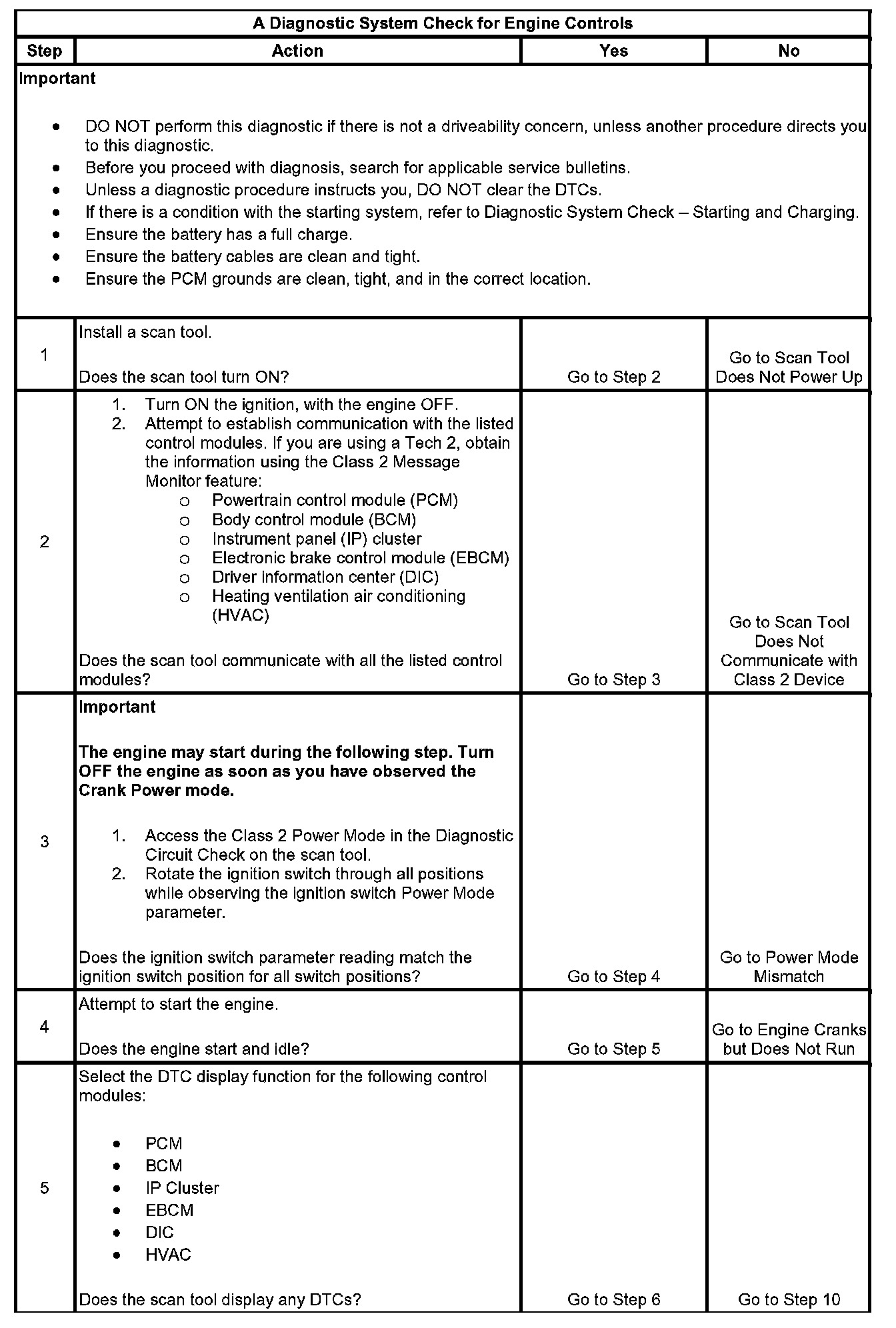 The Diagnostic System Check - Computers and Control Systems is an organized approach to identifying a condition that is created by a malfunction in the engine control system. The Diagnostic System Check must be the starting point for any driveability concern. The Diagnostic System Check directs the service technician to the next logical step in order to diagnose the concern. Understanding and correctly using the diagnostic table reduces diagnostic time and prevents the replacement of good parts.