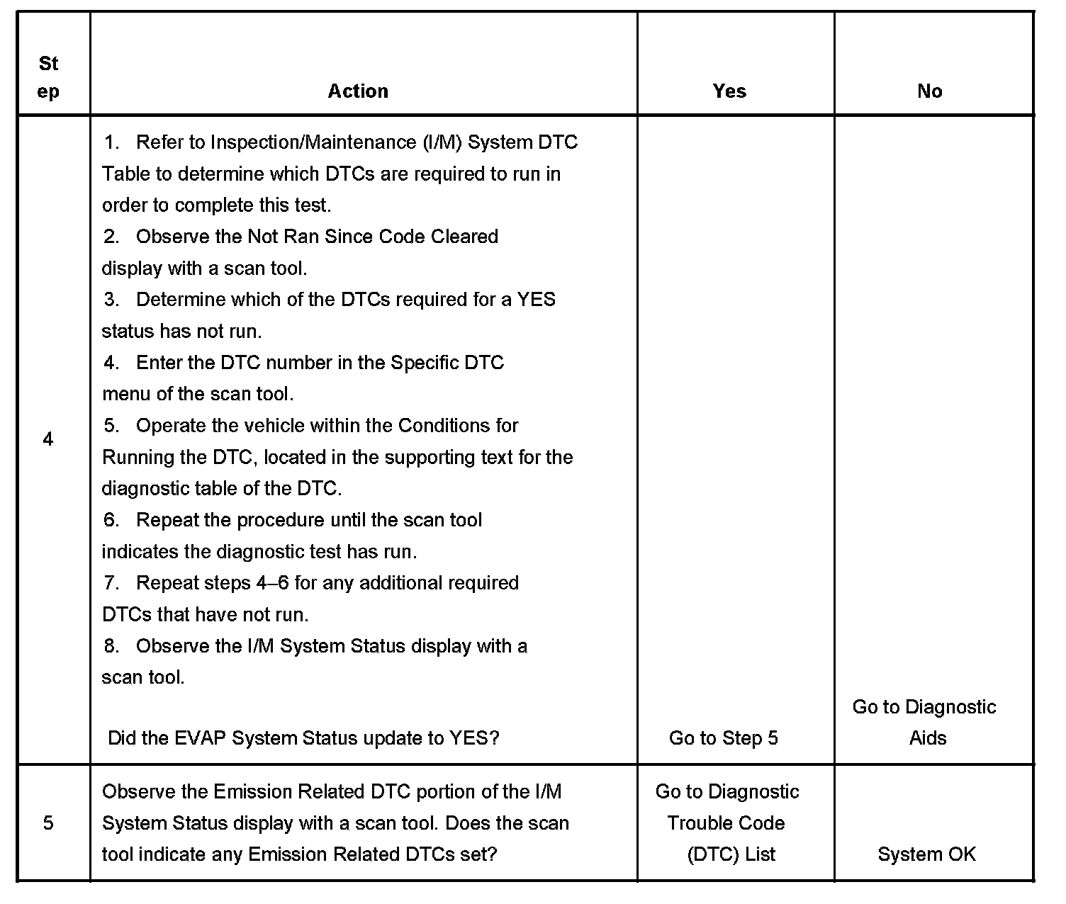 The purpose of this test is to satisfy the enable criteria necessary to execute I/M readiness diagnostics for the evaporative emission (EVAP) system. The test may be used to set the I/M System Status indicators to YES. The I/M System Status Display on the scan tool provides an indication of when the control module has completed the required tests. The I/M System Status does not indicate that the tests have passed or failed. When all of the diagnostics for a specific system have run and passed, the I/M System Status will update to YES. If a test for a specific system has failed, the I/M System Status will update to YES, indicating a determination was made, even if all of the other tests for that system have not run. Performing a visual inspection prior to running the EVAP test may prevent having to repeat the test. A failed or aborted test will require the vehicle to cool down in order to meet the enable criteria to run another test.