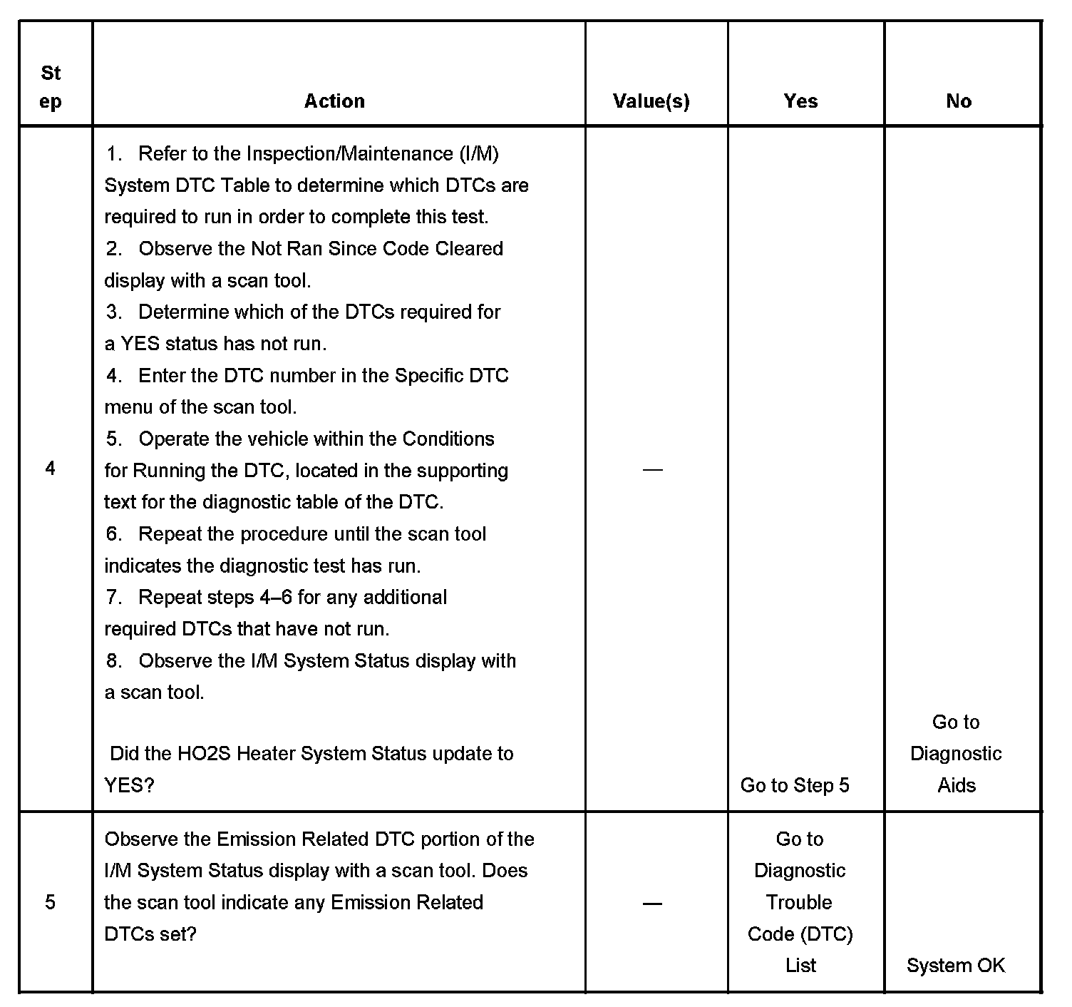 The purpose of this test is to satisfy the enable criteria necessary to execute inspection/maintenance (I/M) readiness diagnostics for the heated oxygen sensor (HO2S) heater system. The test may be used to set the I/M System Status to YES. The I/M System Status display on the scan tool provides an indication of whether the control module has completed the required tests. The I/M System Status does not indicate that the tests have passed or failed. When all of the diagnostics for a specific system have run and passed, the I/M System Status will update to YES. If a test for a specific system has failed, the I/M System Status will update to YES, indicating a determination was made, even if all of the other tests for that system have not run.