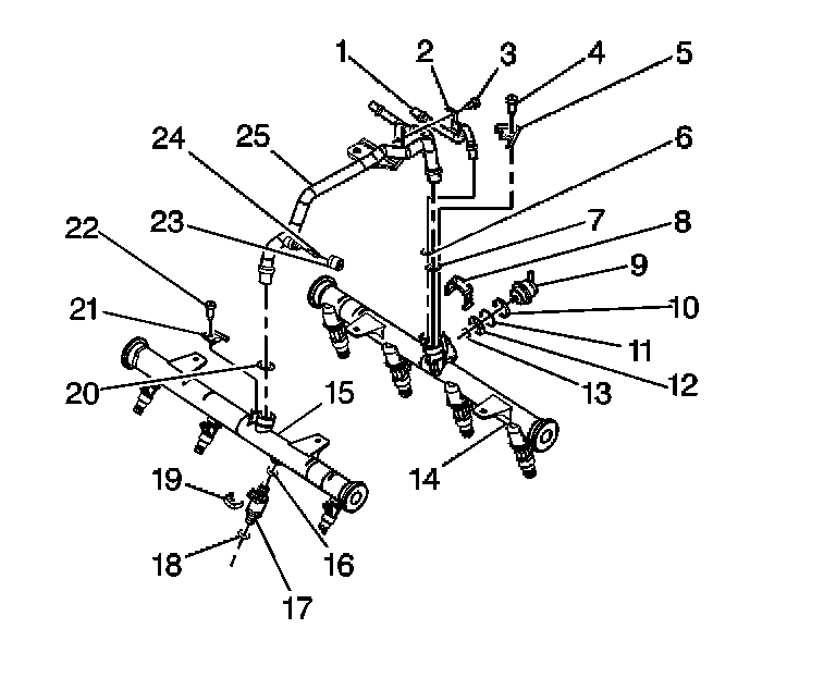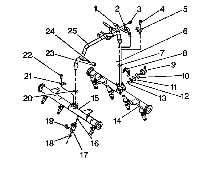 3. Install the crossover pipe (25) to the left fuel rail (14) and the right fuel rail (15).