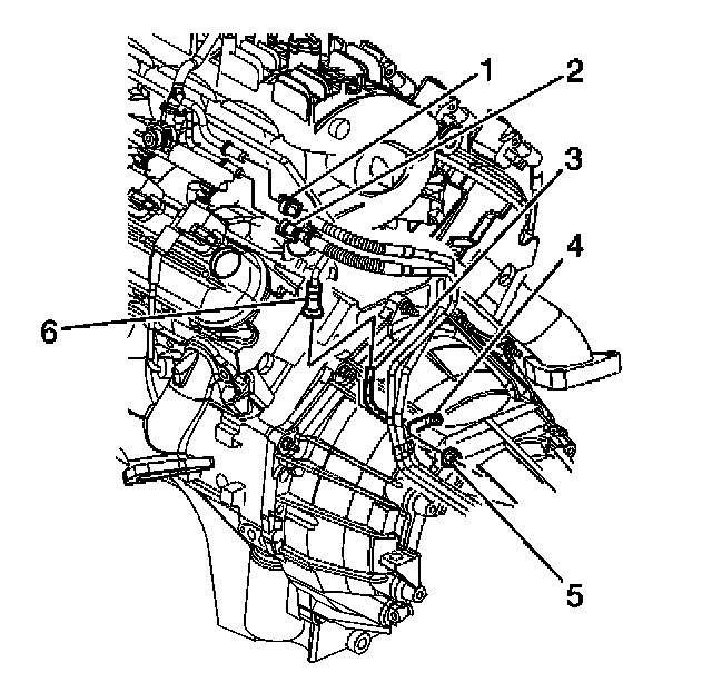 9. Remove the retainer clip attaching screw (4) and the crossover fuel pipe to the left fuel rail retainer clip (5).