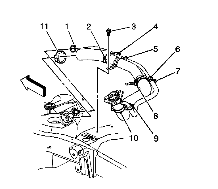 6. Remove the fuel fill hose and the hose clamps (11, 2).