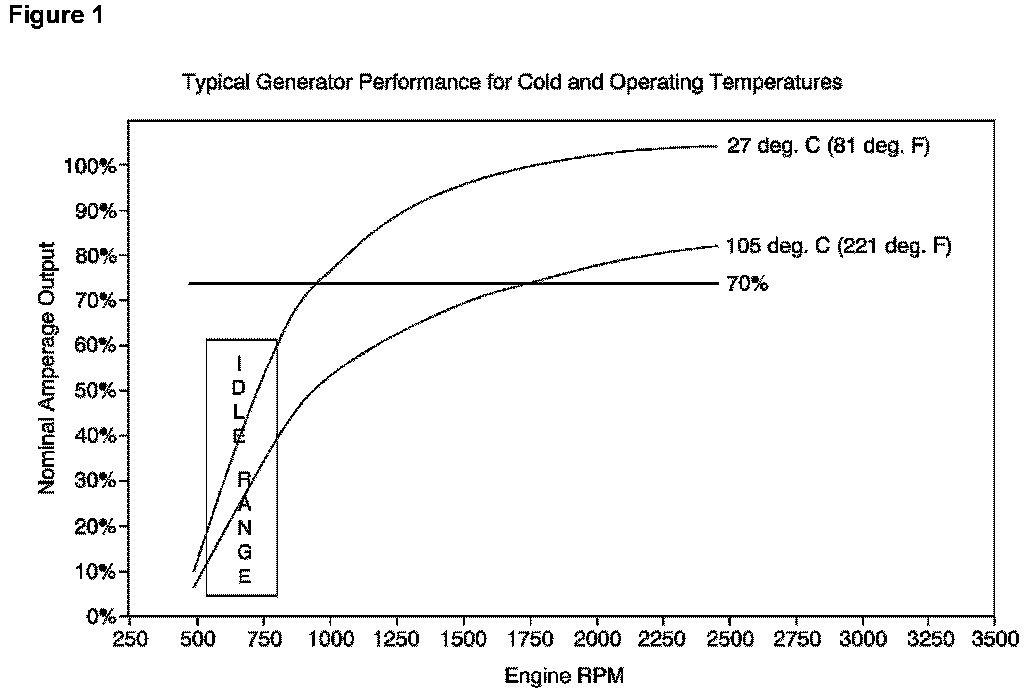 ^ At idle, vehicle electrical loads may exceed the low speed current (amperage) output of the generator and when this happens the shortfall comes from the battery. This will result in a drop in the electrical system voltage as the battery delivers the additional electrical current to meet the demand. This is equivalent to the brown outs experienced by homes and businesses when the electrical demand is more than the supply. See Figure 1.
