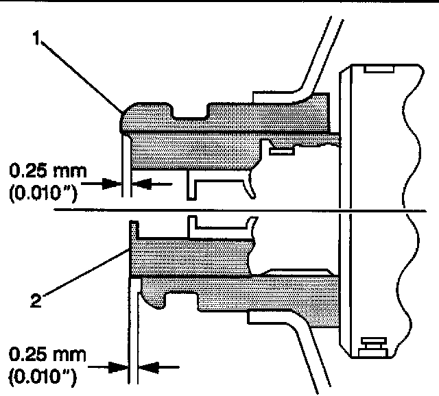 3. Install the power steering pump pulley (1) flush against the end of the power steering pump shaft (2), with an allowable variance of 0.25 mm (0.010 inch).