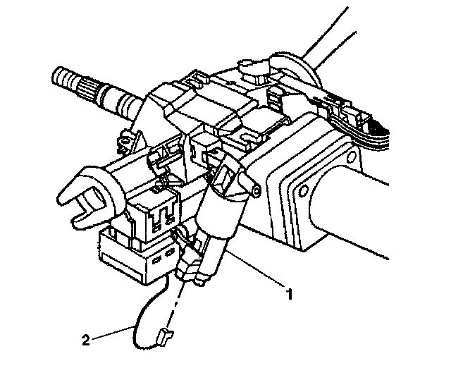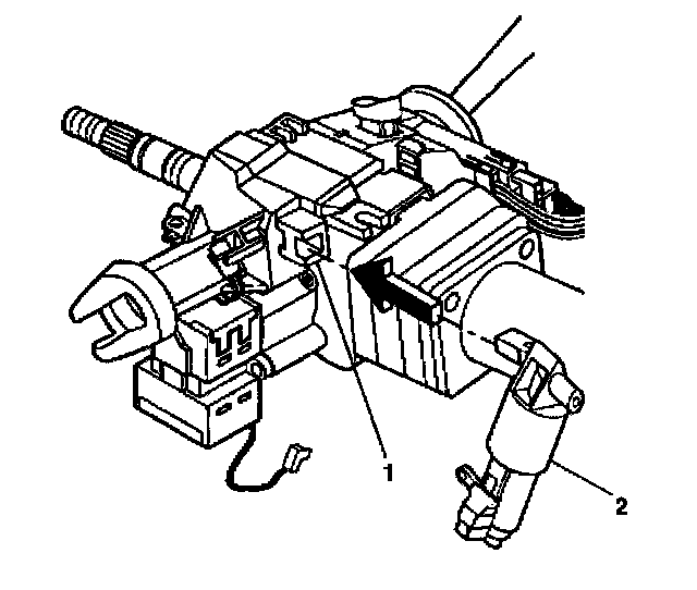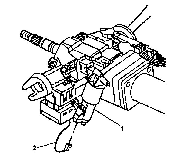 4. Pry the electric park lock (2) off of the ignition lock cylinder case assembly (1).