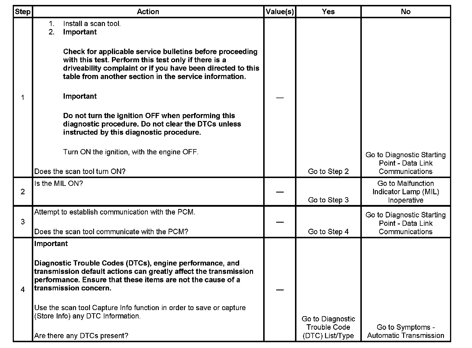 ^ Poor engine performance can sometimes be diagnosed as a transmission driveability condition. In order to avoid mis-diagnosis of the automatic transmission, always perform the Diagnostic System Check - Engine Controls, Initial Inspection and Diagnostic Overview