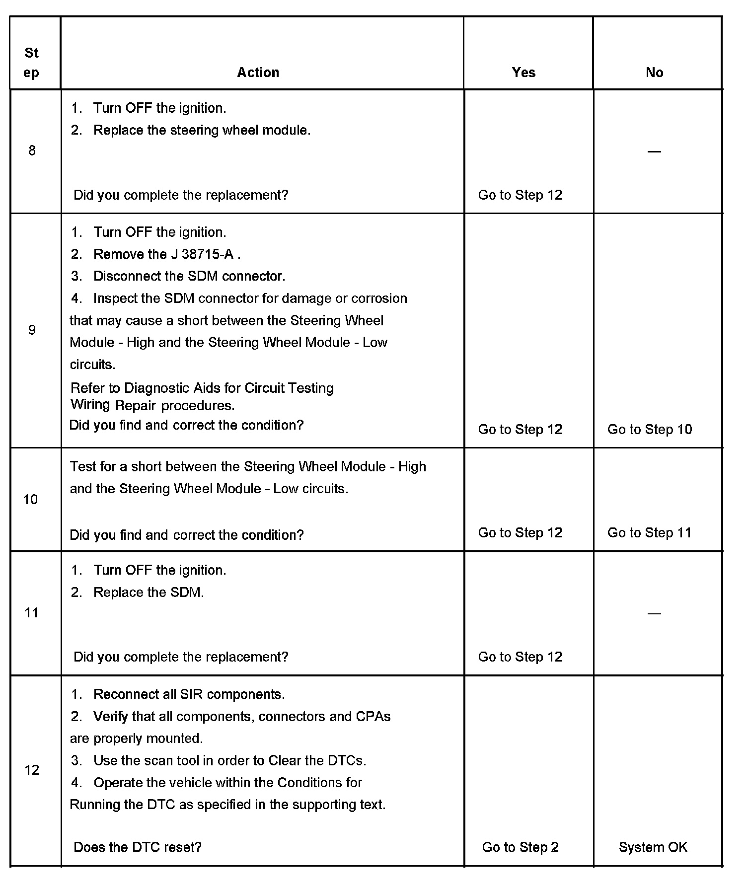 CIRCUIT DESCRIPTIONThe steering wheel module deployment loop consists of an inflatable restraint steering wheel module, an inflatable restraint steering wheel module coil, the steering wheel module - high and steering wheel module - low circuits. A shorting bar is used in the inflatable restraint steering wheel module and the inflatable restraint steering wheel module coil connectors which will short together the steering wheel module - high and steering wheel module - low circuits when the connector is disconnected, this will help to prevent unwanted deployment of the inflator module during servicing. During a frontal crash of sufficient force the SDM will allow current to flow through the deployment loop in order to deploy the inflatable restraint steering wheel module. The SDM performs continuous diagnostic tests on the deployment loops to check for proper circuit continuity and for shorts to ground or voltage. If a malfunction is detected, a DTC will be stored.