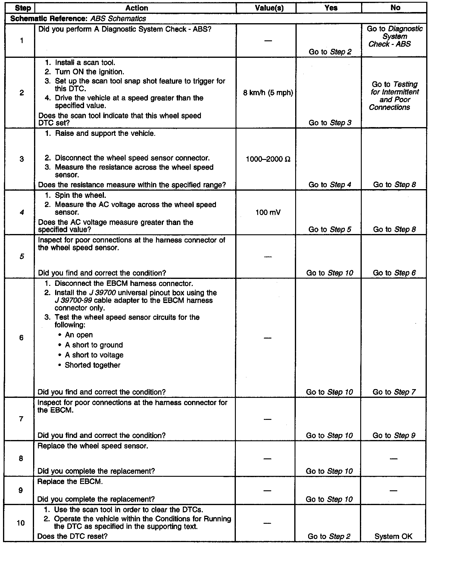 ^ An open - the wheel speed sensor signal circuit voltage is greater than 4.25 volts and wheel speed sensor return circuit voltage is less than 0.75 volts.