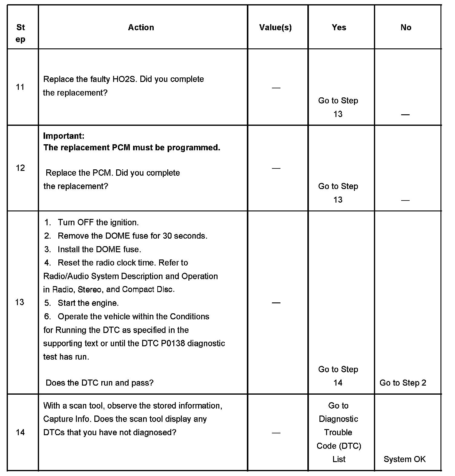 13. Clearing the DTCs by removing the DOME fuse also clears the PCM long term memory. Using the scan tool to clear DTCs leaves the long term memory active. DTC emitting diagnostics may not run to completion as expected unless the long term memory is cleared. Removal of the DOME fuse also clears the time display of the radio. The DTC P0138 diagnostic can be monitored on the scan tool under the Not Ran Since Code Cleared selection in the DTC Information menu. If a DTC P0138 appears in the Not Ran Since Code Cleared list, the DTC P0138 diagnostic has not yet run. When the DTC P0138 does not appear in the Not Ran Since Code Cleared list, the DTC P0138 diagnostic has run. If the MIL is NOT illuminated, and there is no Pending DTC Status in DTC Information, the DTC P0138 diagnostic has passed. The DTCs MUST be cleared in order to view the Current Status of the Not Ran Since Code Cleared list. DO NOT forget that the Not Ran Since Code Cleared list only indicates that the test has run, not whether the test passed or failed. The DTC Information screen must be checked for Current or Pending status, in order to determine the outcome of the diagnostic test involved.