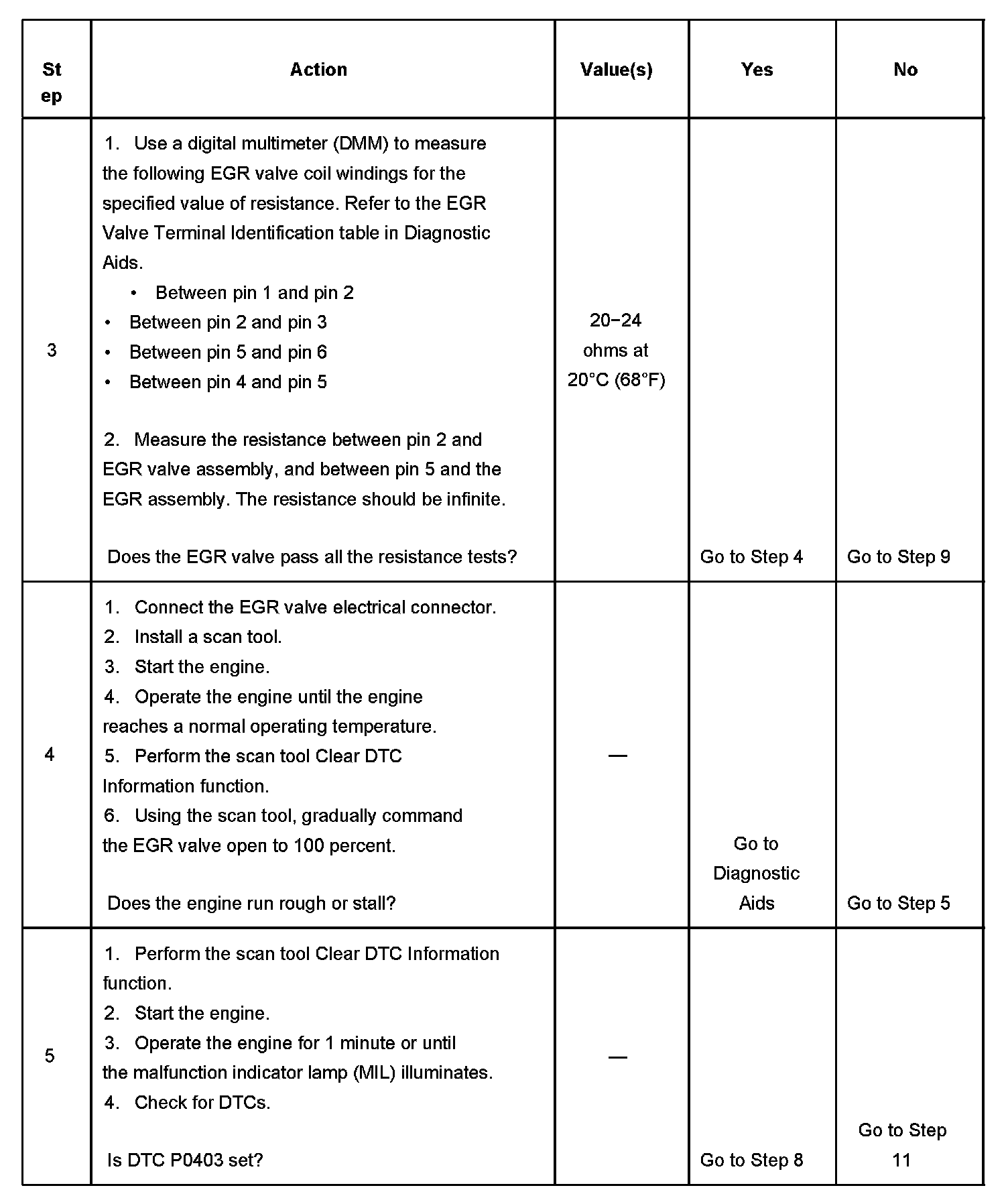 CIRCUIT DESCRIPTIONThe DTC P0403 Exhaust Gas Recirculation (EGR) Solenoid Control Circuit diagnostic monitors the electrical circuitry of the EGR valve. The EGR system controls the formation of oxides of nitrogen (NOx) emissions by recirculating the exhaust gases into the combustion chamber. The EGR valve is a stepper motor design. The stepper motor moves a spring loaded plunger that controls the flow of exhaust gases into the intake manifold. The plunger movement is controlled by the powertrain control module (PCM). By turning the stepper motor in different directions, the PCM controls the opening of the exhaust gas passage to the intake manifold. The stepper motor has 4 coil windings that control the motor movement. The DTC P0403 diagnostic monitors the electrical circuits of the 4 coils.