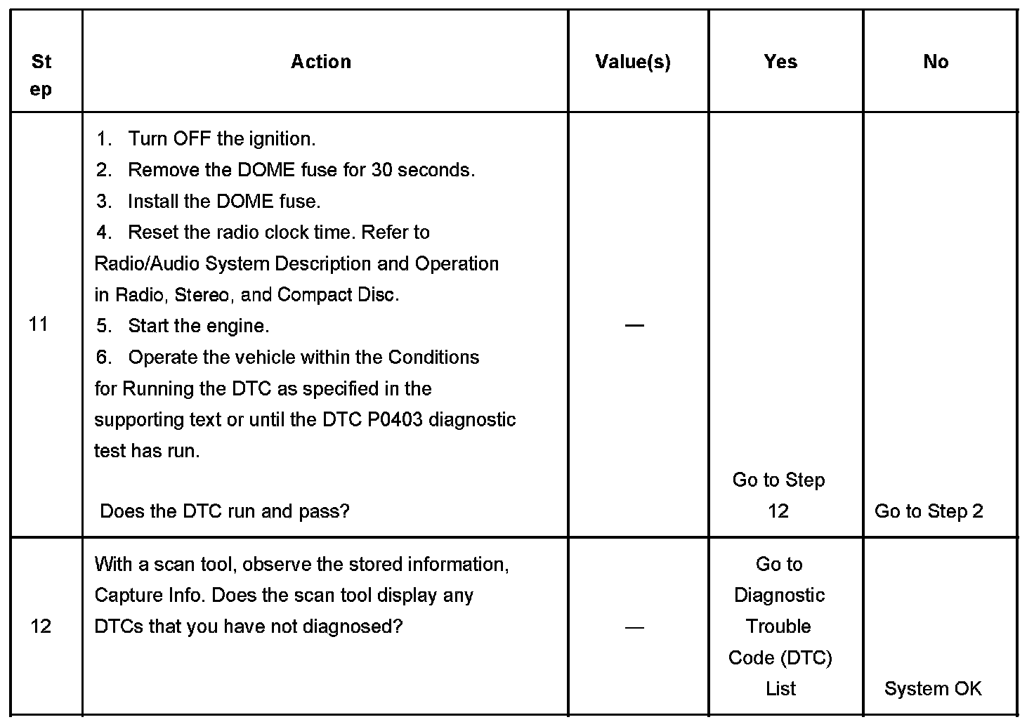 11. Clearing the DTCs by removing the DOME fuse also clears the PCM long term memory. Using the scan tool to clear DTCs leaves the long term memory active. DTC emitting diagnostics may not run to completion as expected unless the long term memory is cleared. Removal of the DOME fuse also clears the time display of the radio. The DTC P0403 diagnostic can be monitored on the scan tool under the Not Ran Since Code Cleared selection in the DTC Information menu. If a DTC P0403 appears in the Not Ran Since Code Cleared list, the DTC P0403 diagnostic has not yet run. When the DTC P0403 does not appear in the Not Ran Since Code Cleared list, the DTC P0403 diagnostic has run. If the MIL is NOT illuminated, and there is no Pending DTC Status in DTC Information, the DTC P0403 diagnostic has passed. The DTCs MUST be cleared in order to view the Current Status of the Not Ran Since Code Cleared list. DO NOT forget that the Not Ran Since Code Cleared list only indicates that the test has run, not whether the test passed or failed. The DTC Information screen must be checked for Current or Pending status, in order to determine the outcome of the diagnostic test involved.