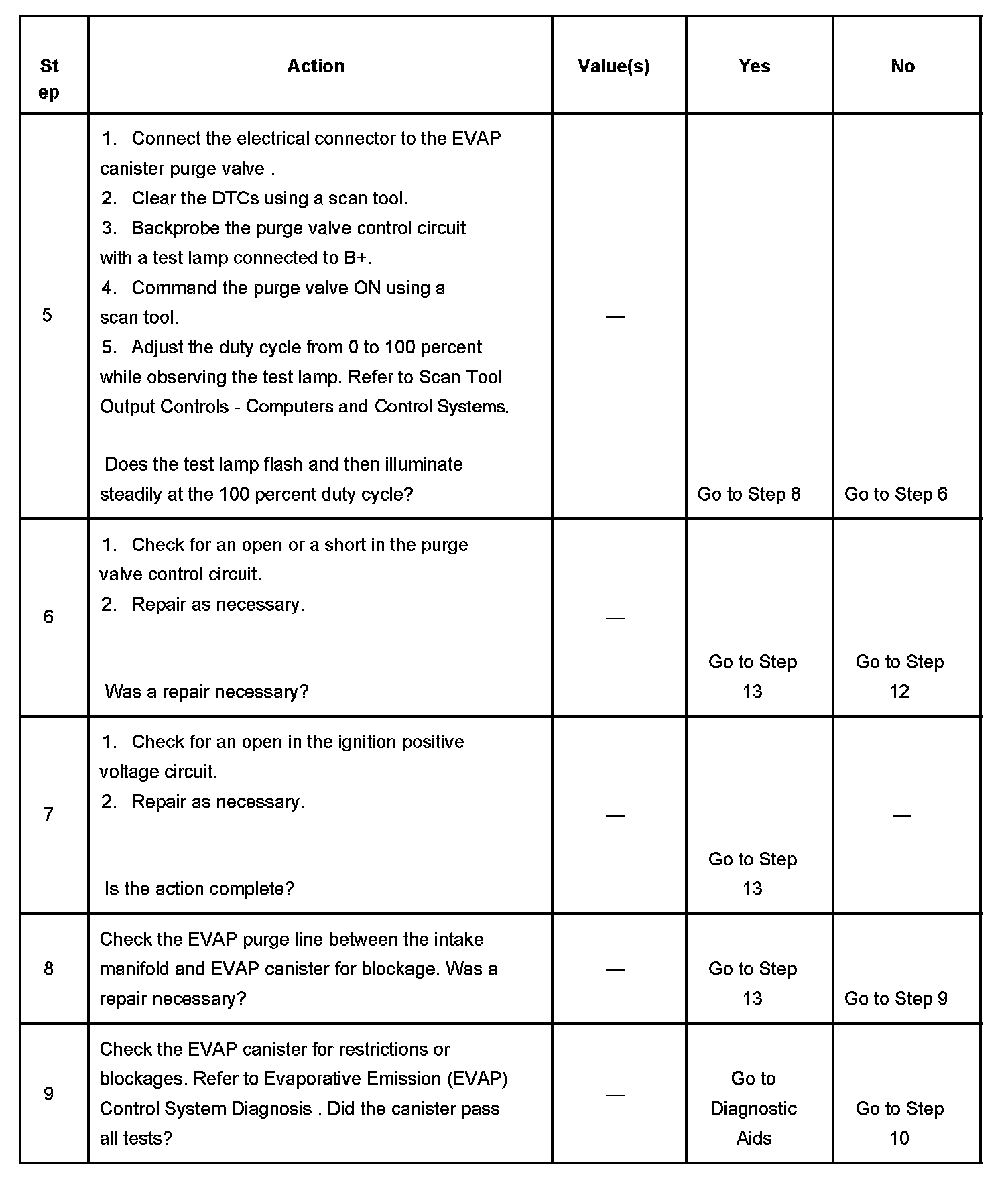 5. This step checks the control circuit of the EVAP canister purge valve. The duty cycle control of the EVAP canister purge valve is disabled by the PCM until the engine has reached a normal operating temperature of at least 80°C (176°F), there is no RPM indicated, and there are no DTCs set. The output controls can be found on the scan tool under Special Functions.