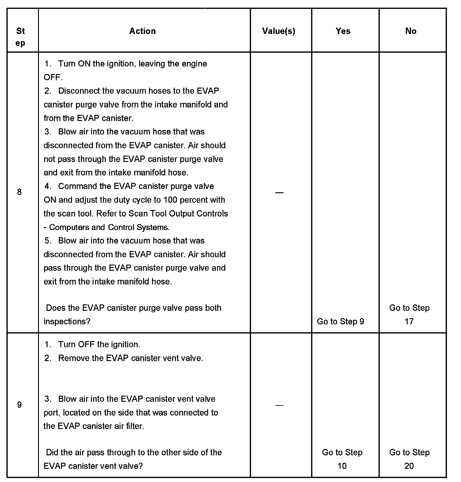 9. This step checks the operation of the EVAP canister purge valve. The duty cycle control of the EVAP canister purge valve is disabled by the PCM when any DTCs are stored and when engine speed is indicated.