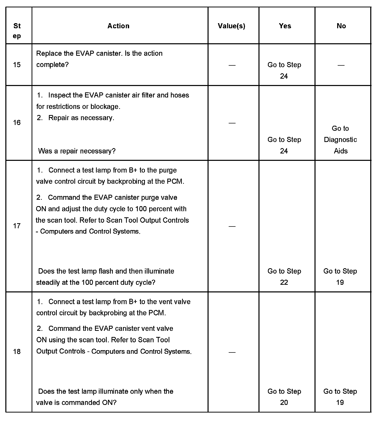 10. This step checks the operation of the EVAP canister vent valve. The output control of the EVAP canister vent valve is disabled by the PCM when any DTCs are stored and when engine speed is indicated.