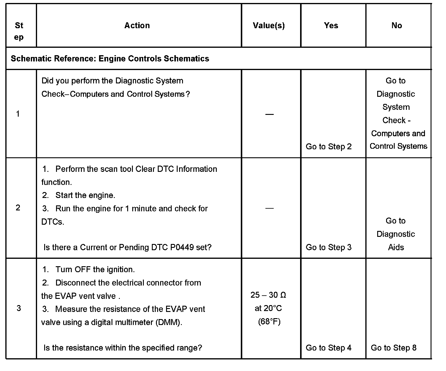 CIRCUIT DESCRIPTIONThe DTC P0449 Evaporative Emission (EVAP) Vent System Performance diagnostic monitors the control circuit voltage of the EVAP vent valve. Ignition voltage is supplied directly to the EVAP vent valve solenoid. The powertrain control module (PCM) supplies a ground path to the solenoid control circuit using an internal solid state device called a driver. Each driver has a fault line that is monitored by the PCM. When the PCM commands the solenoid ON, the voltage on the control circuit should be near zero or low. When the PCM commands the solenoid OFF, the voltage on the control circuit should be near battery voltage or high. If the fault detection circuit senses a voltage other than what is expected, this DTC will set.