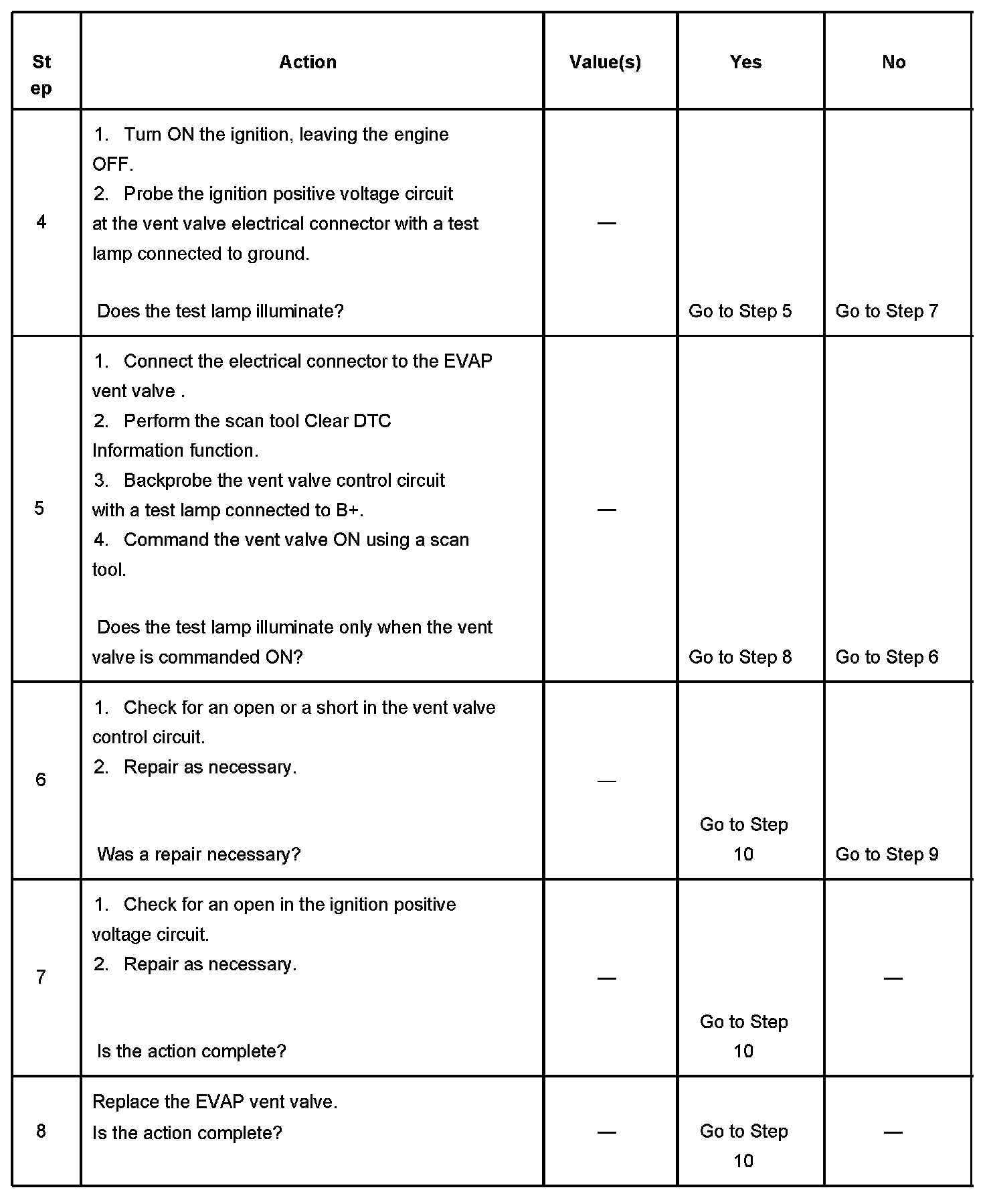 5. This step checks the control circuit of the EVAP vent valve. The duty cycle control of the EVAP vent valve is disabled by the PCM until the engine has reached a normal operating temperature of at least 80°C (176°F), there is no RPM indicated, and there are no DTCs set. The output controls can be found on the scan tool under Special Functions.
