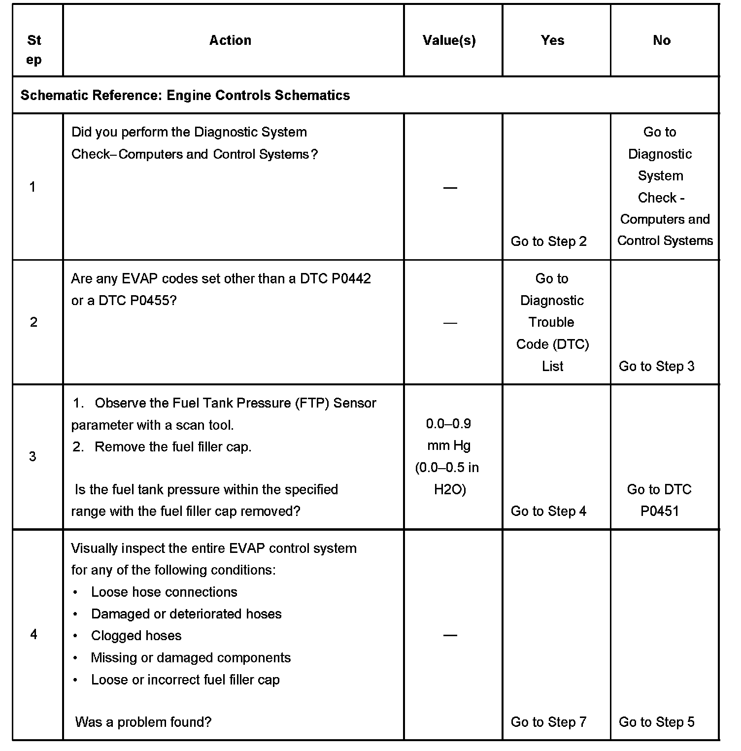 3. This step checks the operation of the FTP sensor. If the FTP sensor does not indicate near zero pressure when the fuel filler cap is removed, the FTP sensor or circuit might be faulty. The FTP sensor can be checked by using the diagnostics in DTC P0450.