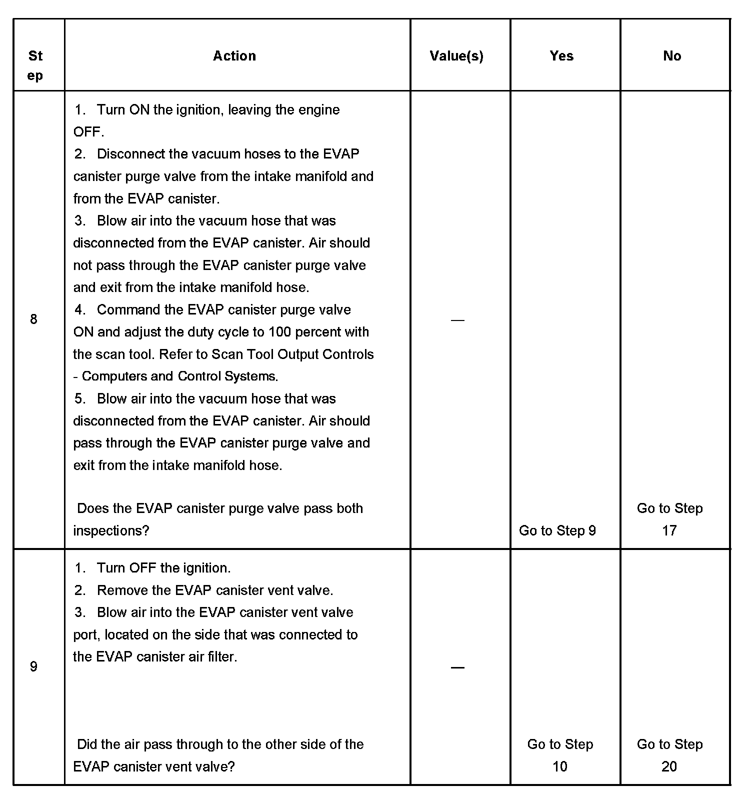 9. This step checks the operation of the EVAP canister purge valve. The duty cycle control of the EVAP canister purge valve is disabled by the PCM when any DTCs are stored and when engine speed is indicated.