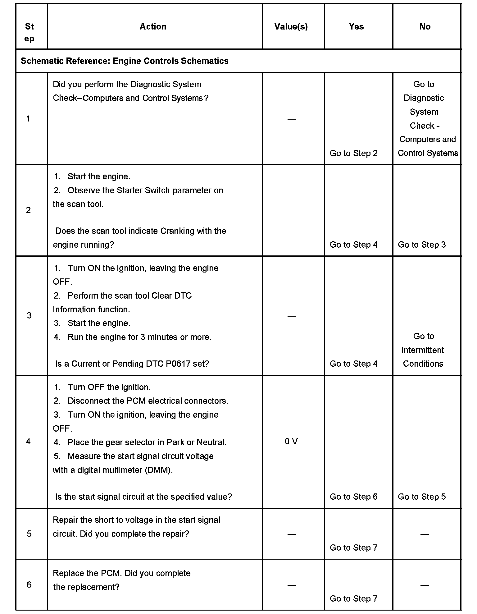 CIRCUIT DESCRIPTIONThe DTC P0617 Starter Relay Control Circuit High Voltage diagnostic monitors the voltage signal that is sent from the ignition switch when starting the engine. When the engine is being cranked, battery voltage is applied to the powertrain control module (PCM). On a cold engine the PCM can increase the fuel injection volume and modify ignition timing when receiving the start signal. This signal passes through the transmission range (TR) switch or the clutch pedal position (CPP) switch. If this signal is not detected during engine cranking, the PCM will still allow the engine to start.