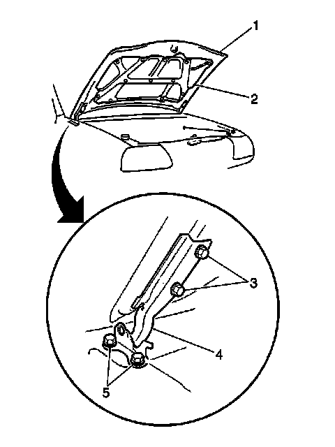 4. Remove the 2 bolts (3) that retain the hood (1) to the hood hinge (4).