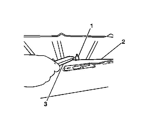 12. Beginning at the rear of the headlining (2), pull down slightly and cut through the beads of adhesive (1) with a utility knife (3) in order to unsecure the headlining (2).