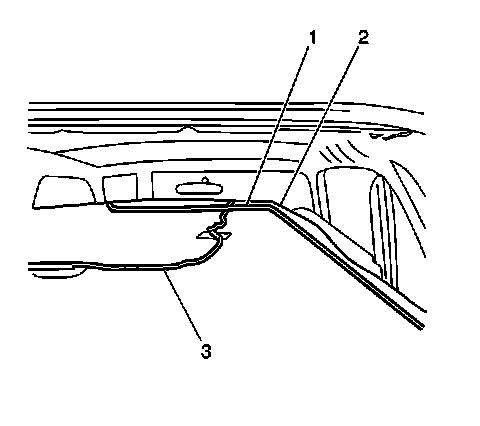 15. Remove the interior lighting wiring harness (3) from the headlining trim finish panel (2).