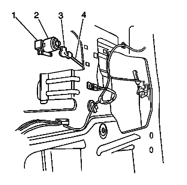 4. Install the rear door lock cylinder control rod (4) to the rear door lock cylinder (2). Secure the rod by closing the rear door lock cylinder control rod retainer (3).