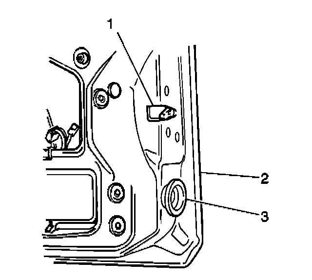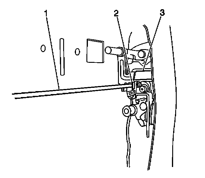 3. Install the rear door lock cylinder control rod (1) to the rear door lock (3). Secure the rod by closing the rear door lock cylinder control rod retainer (2).