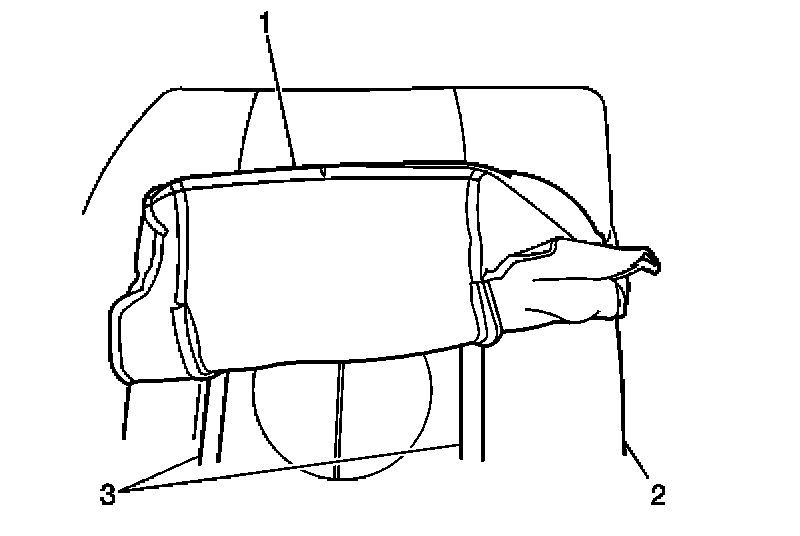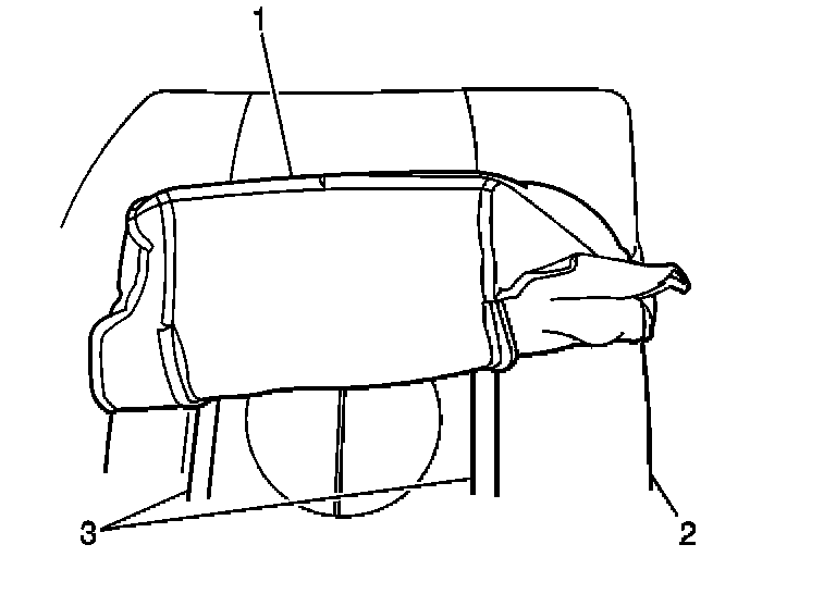 1. Install the rear seat back cushion cover (1) to the rear seat back cushion pad and frame (2). Ensure that the cover is fully secured to the pad at the velcro strips (3).