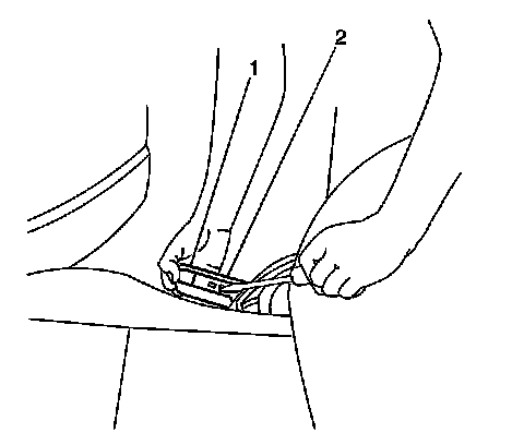 2. Release the retaining tab (2) and remove the recliner knob (1) from the seat outer adjuster.