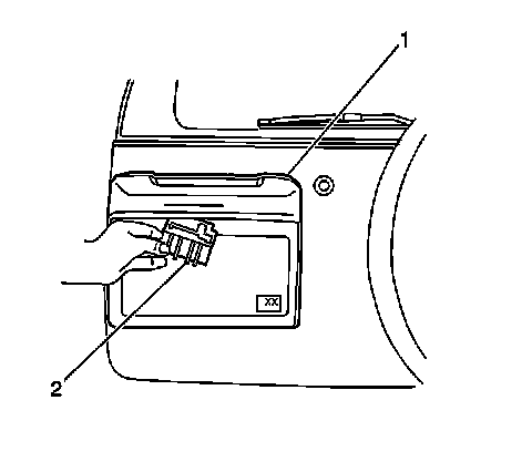 3. Remove the endgate outside handle (2) from the rear license plate housing (1).
