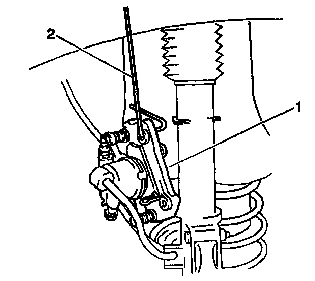 5. Remove the 2 mounting bolts, the caliper (1), and the caliper bracket (2).
