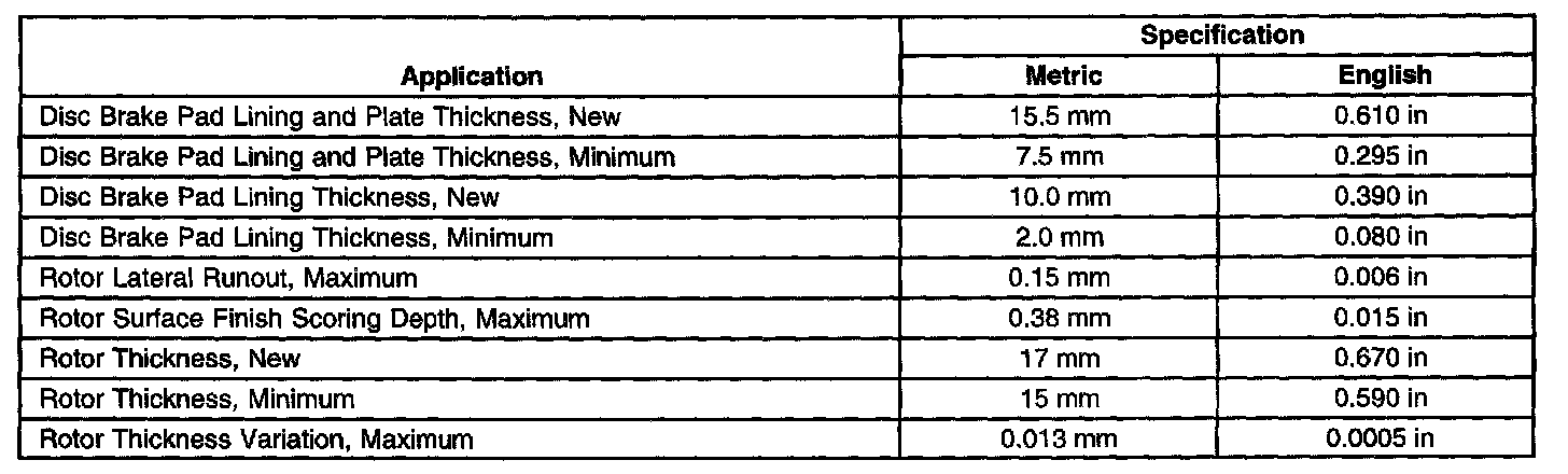 Disc Brake Component Specifications: