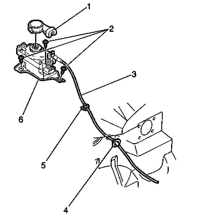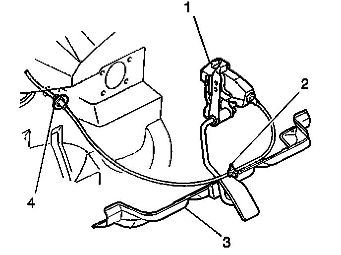 1. Install the cruise control servo cable to the vehicle. Secure the cable with the retainer (2) and the grommet (4).