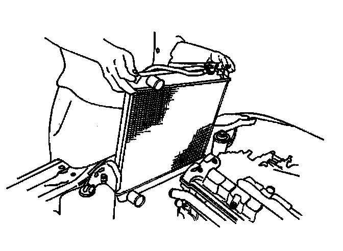 14. Lean the fan shroud toward the engine and lift the radiator up and out of the vehicle.