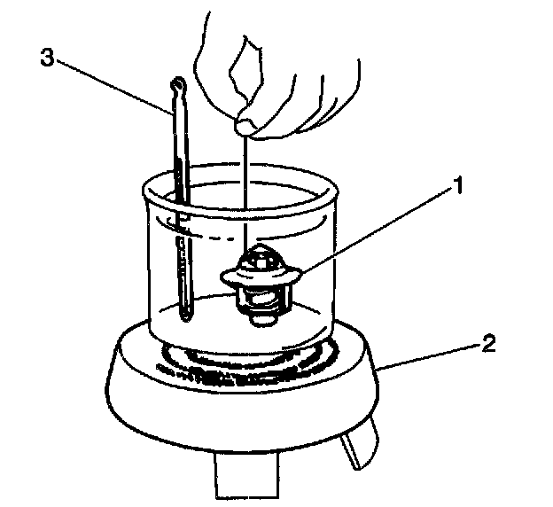 1. Suspend the thermostat (1) and a thermometer (3) in a pan in a 50/50 mixture of ethylene glycol and water. Do not let the thermostat or thermometer rest on the bottom of the pan because of the uneven concentration of heat. This could result in inaccurate temperature measurements.