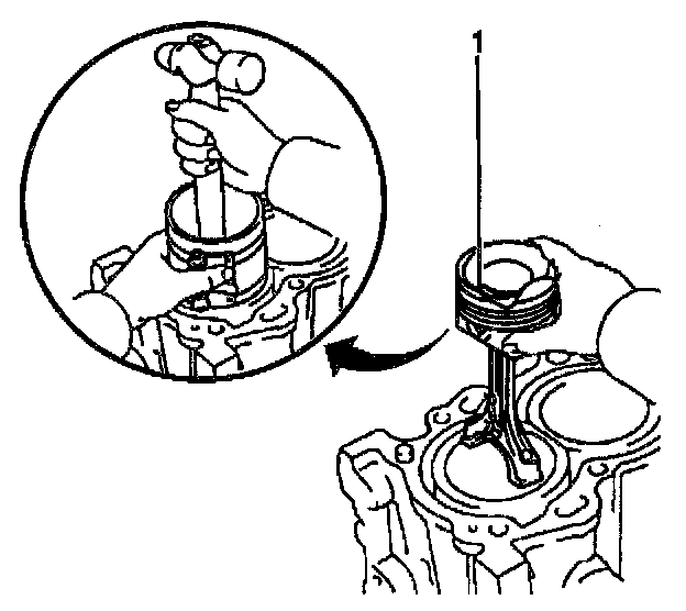 3. Install the piston so that the mark on the top of the piston (1) faces the front of the engine.
