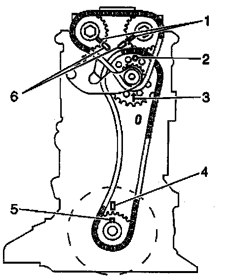 - The guide pins (1) on the camshaft sprockets line up with the notches (6) on the cylinder head.