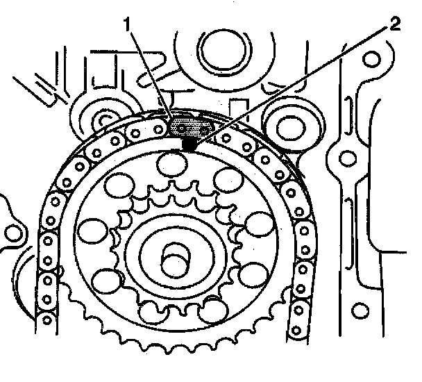 - The yellow link of the crankshaft timing chain (2) is aligned with the crankshaft timing mark (1).