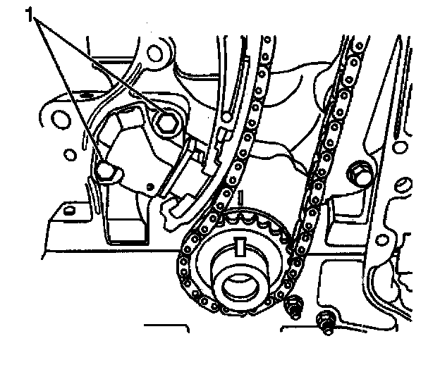 13. Remove the bolt and the crankshaft timing chain adjustable guide (1).