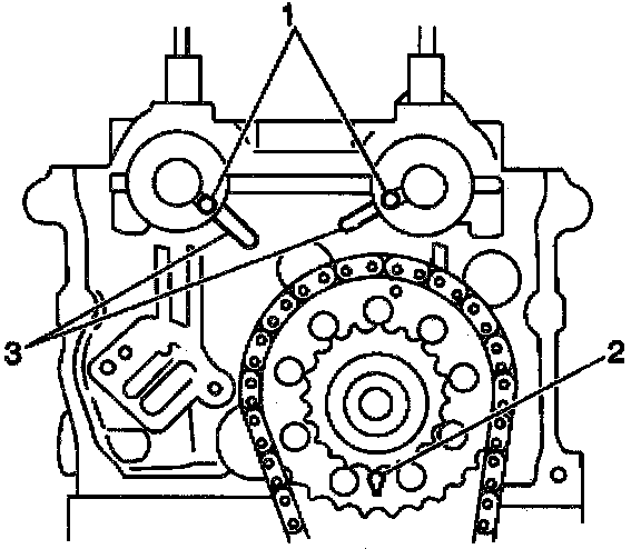 13. Ensure that the guide pins (1) of the camshafts are aligned with the notches (3) on the cylinder head.