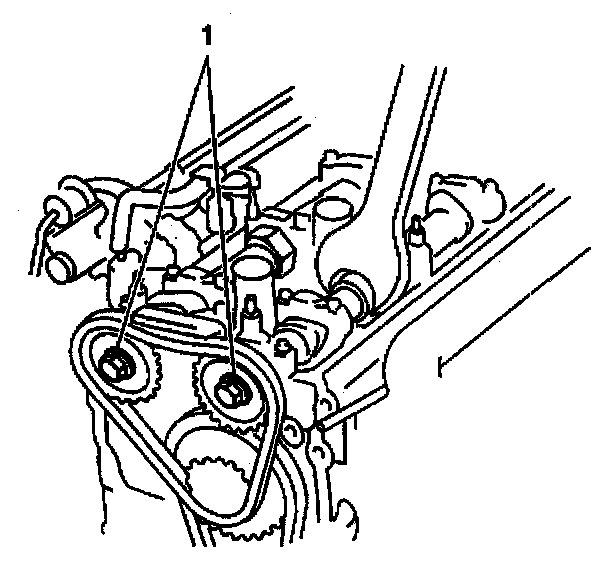 1. Inspect that the timing mark on the engine block (1) is aligned with the crankshaft keyway.