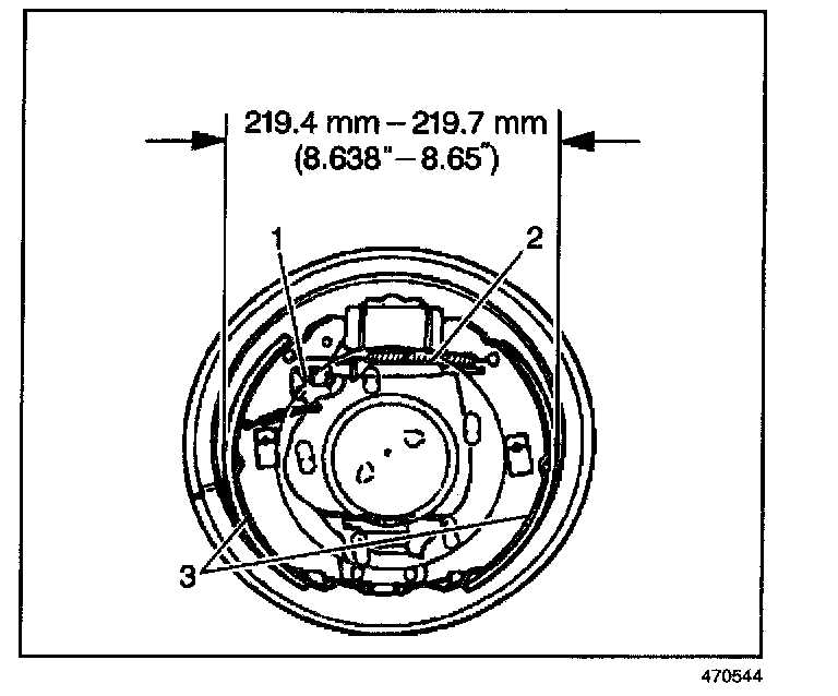18. Before installing the drum, measure the outer diameter of the brake shoes (3). The outer diameter of the brake shoes should be between 219.4 mm (8.638 in) and 219.7 mm (8.650 in). If the outer diameter of the brake shoes is not within specification, turn the adjuster (2) in order to adjust the outer diameter of the shoes.