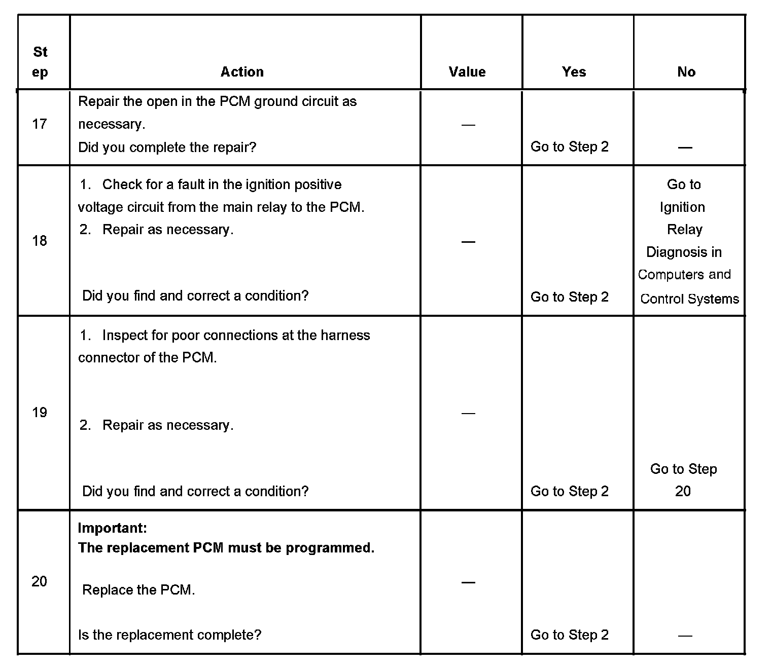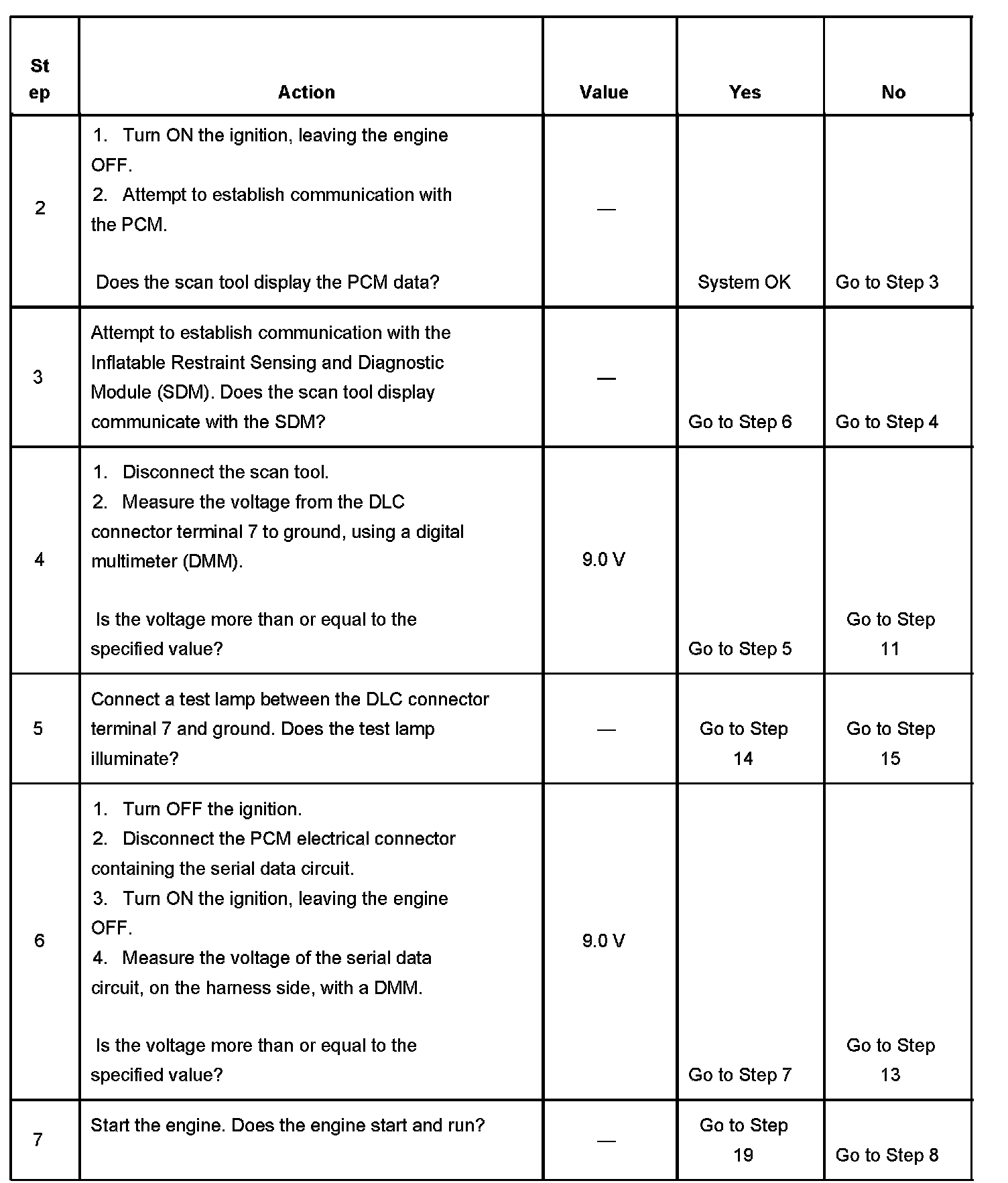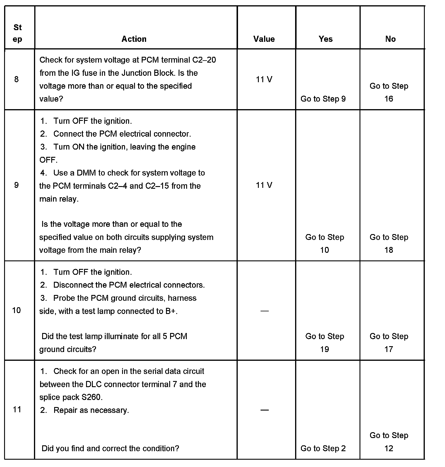 9. This step checks whether the PCM is receiving ignition positive voltage from the main relay when the ignition is ON. The PCM can not provide serial data without ignition positive voltage from the main relay.