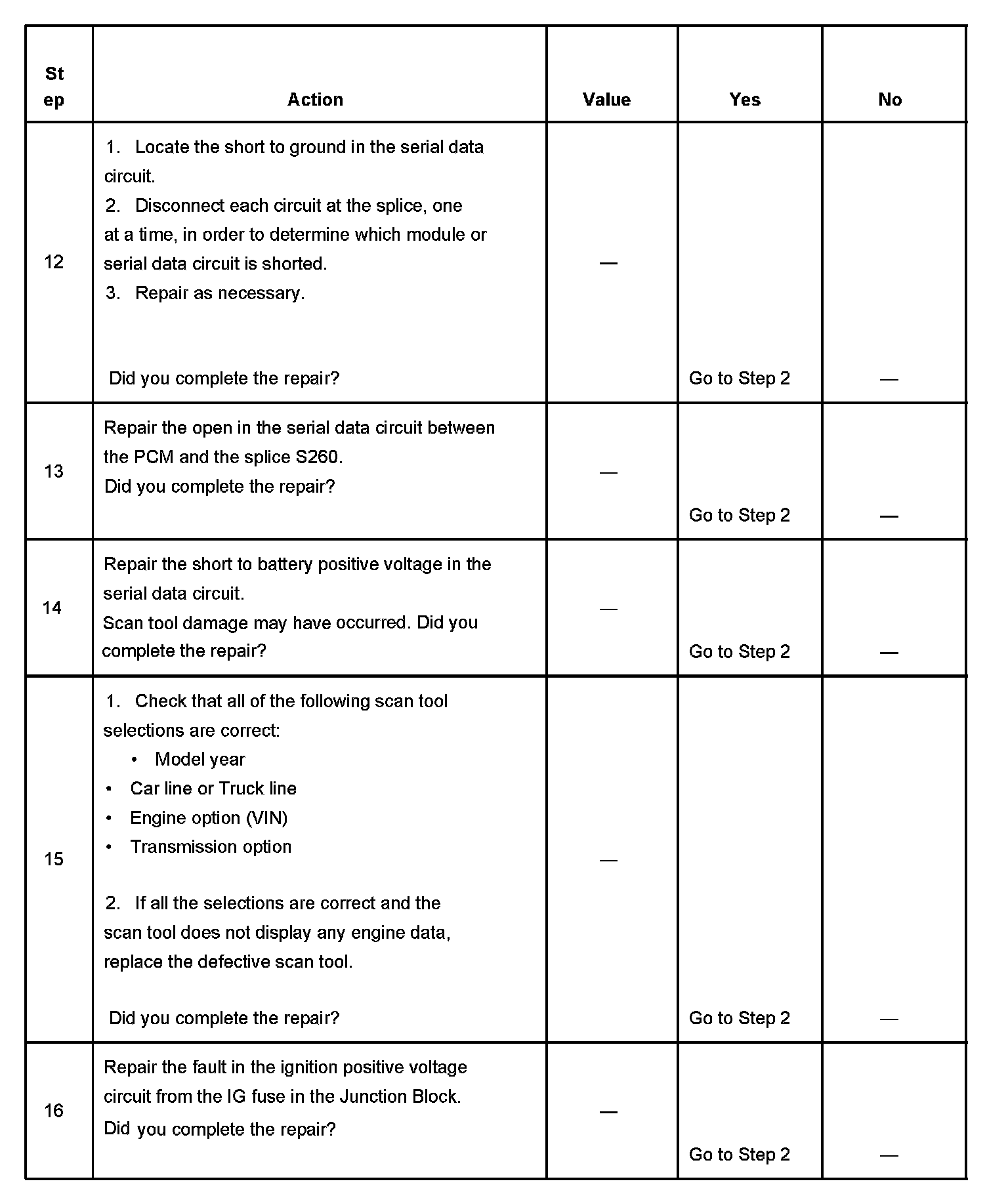14. The scan tool may be damaged by high current flow on the serial data circuit at DLC terminal 7. Check the scan tool for proper operation on a known good vehicle that uses terminal 7 of the DLC for serial data communication.