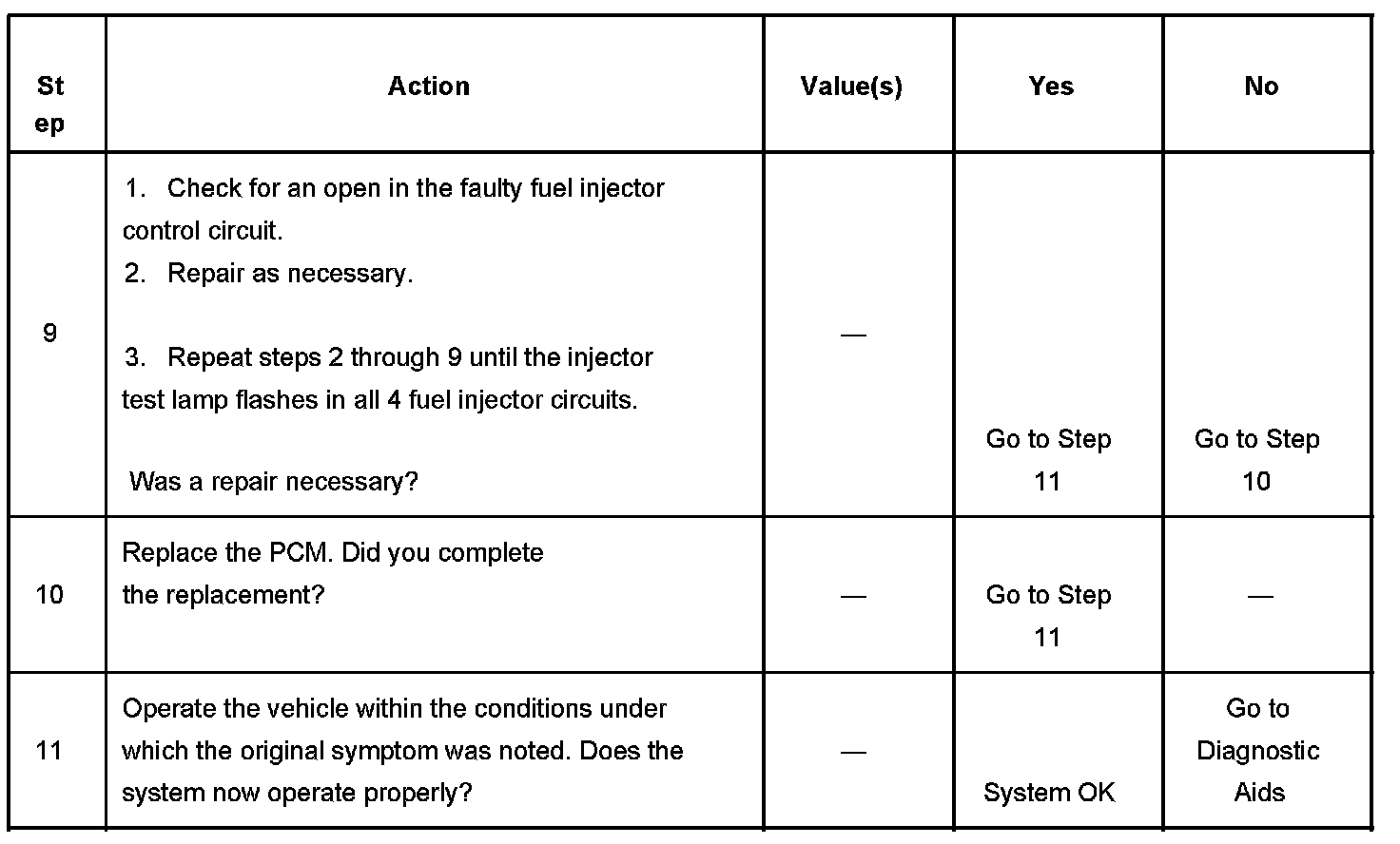 6. This step checks for an open in fuel injector control circuit or for a faulty PCM.